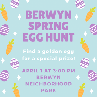 Due to the forecasted rain for Saturday morning, the 3rd Annual Berwyn Egg Hunt will now take place at 3pm on Saturday.Join your neighbors for this fun family event! The event will kickoff at 3pm at the pavilion in the Berwyn Neighborhood Park (Cherry Park). Find a golden egg to receive a special prize! One golden egg will be hidden for each age group.