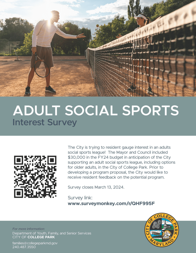 Interested in an adult social sports league? Share your thoughts on a potential adult social sports league program in College Park before March 13, 2024. Visit https://www.surveymonkey.com/r/QHF995F