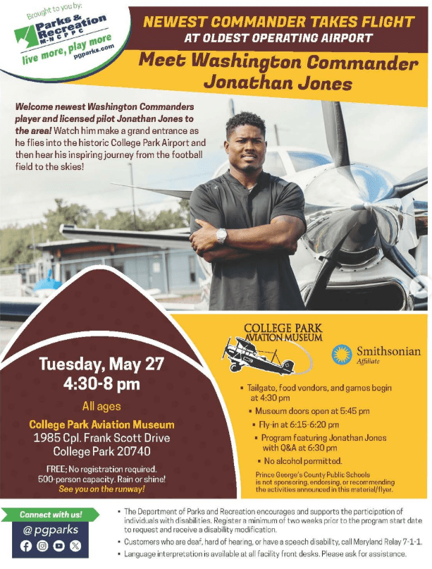 M-NCPPC presenta: El nuevo jugador de futobol americano de los Washington Commanders vuela el aeropuerto más antiguo en operaciones – Conocza a Jonathan Jones, el nuevo jugador de los Washington Commanders