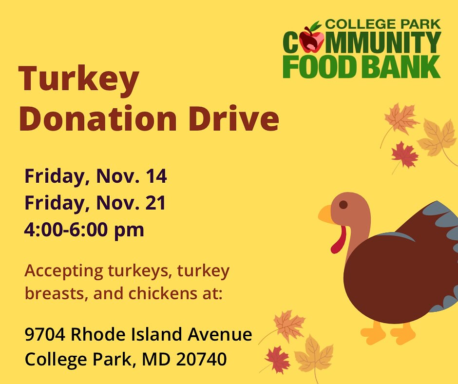 Help fill dinner tables this Thanksgiving! Donate frozen turkeys, turkey breasts, or whole chickens for College Park Community Food Bank to provide to families in need at our Nov. 22 food distribution. Our goal is to collect 350 poultry donations.